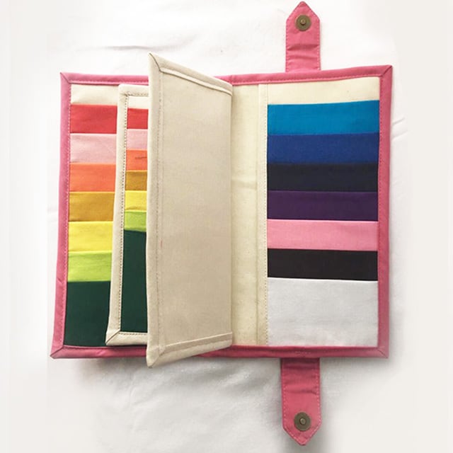 持ち運びの際、カードが飛び出ないように上下をホックで止めます。
